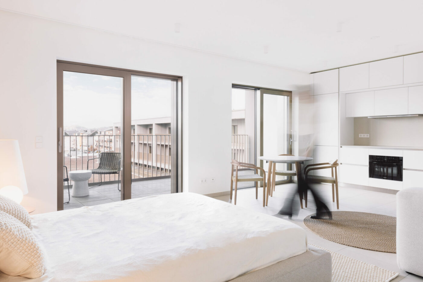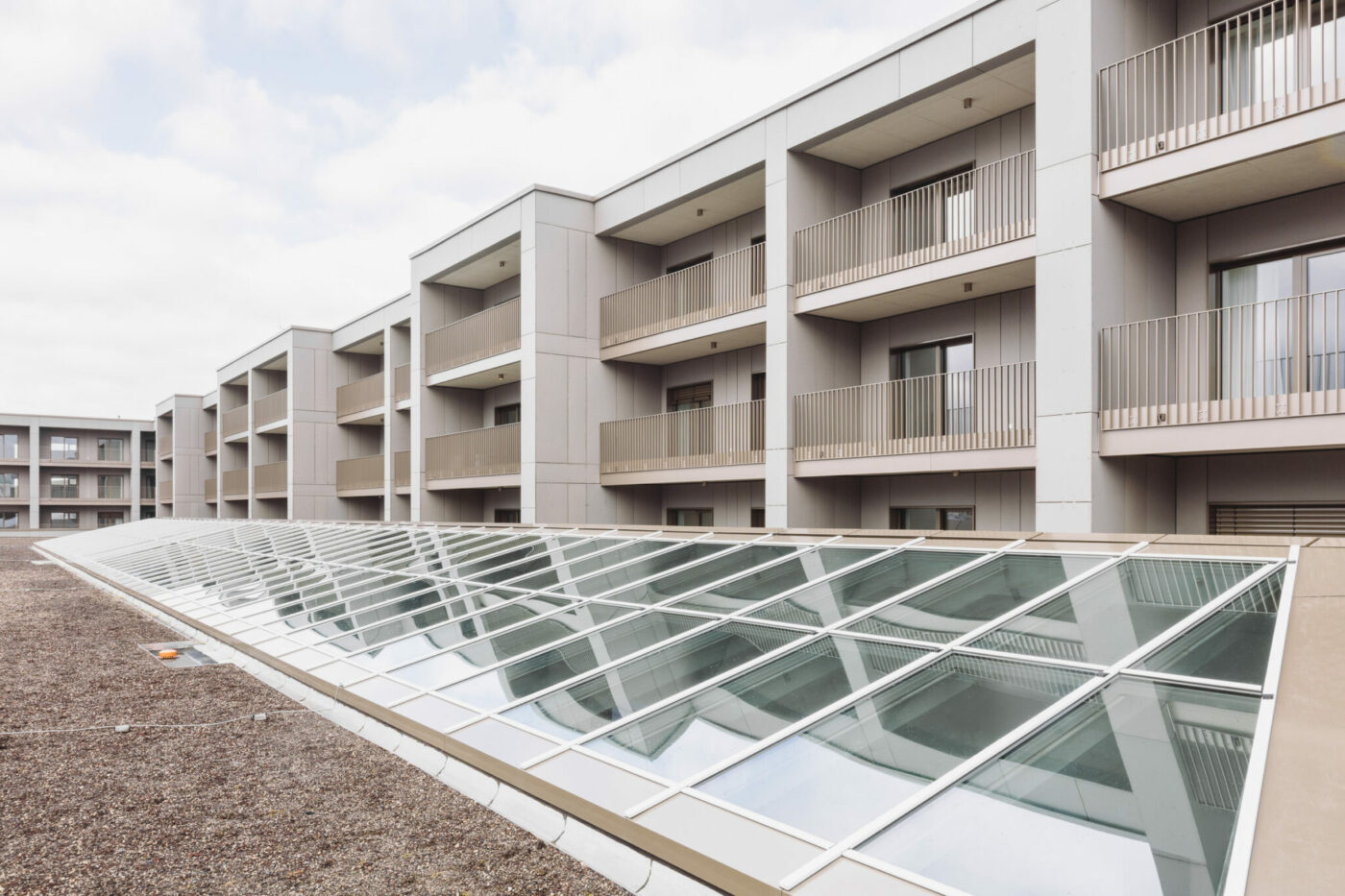 The residences, developed on three floors above the commercial base, are distributed in an L shape on two sides of the main volume. They are served by walkways, which avoids too many corridors and makes it possible to respect a small scale, even on a long façade. In the long term, they could become living and meeting places, or even open-air living areas for the residents. All the flats, ranging from studios to three-bedroom apartments, have a terrace. The flats are comfortable and come equipped with a kitchen and wardrobes.