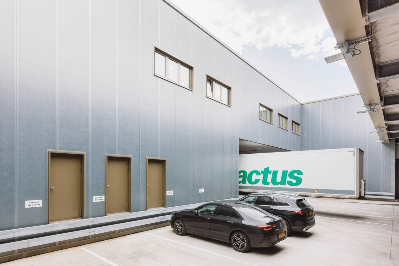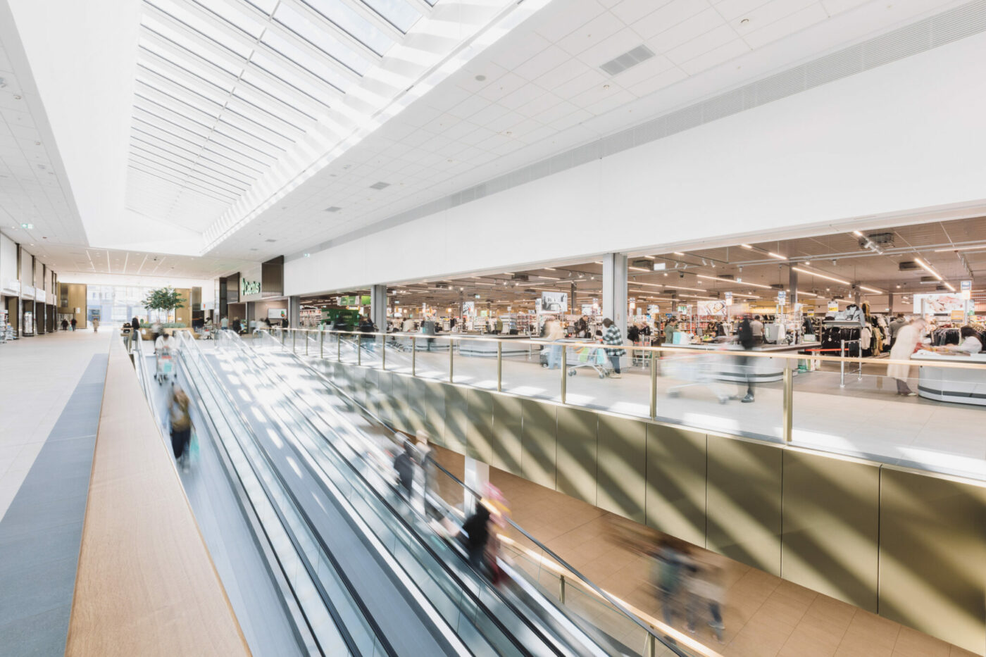 The volume of the fitness centre highlights the entrance to the shopping centre. Its long glass facade creates an animation from the street, avoiding the usual blind facade of shopping centres.