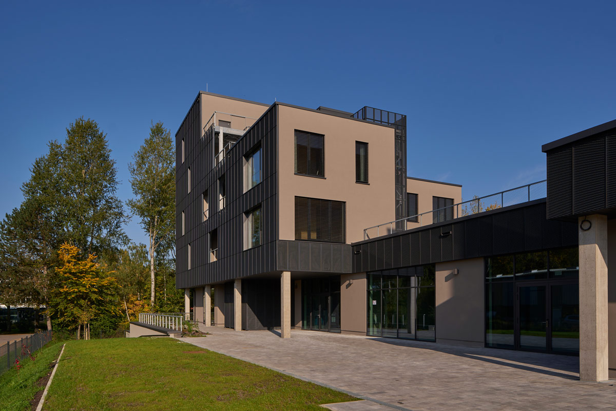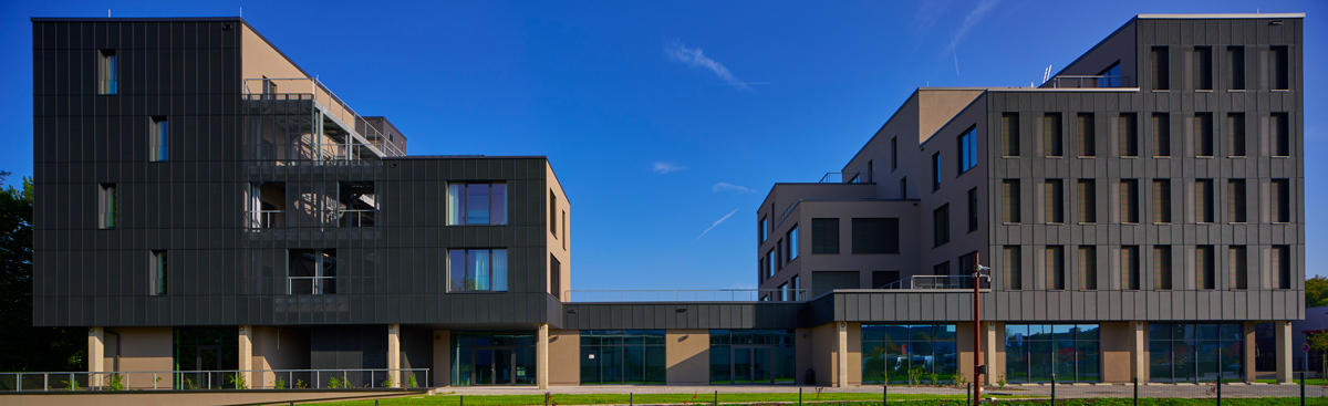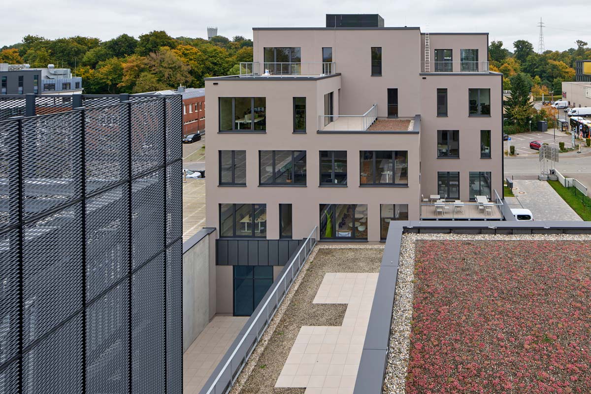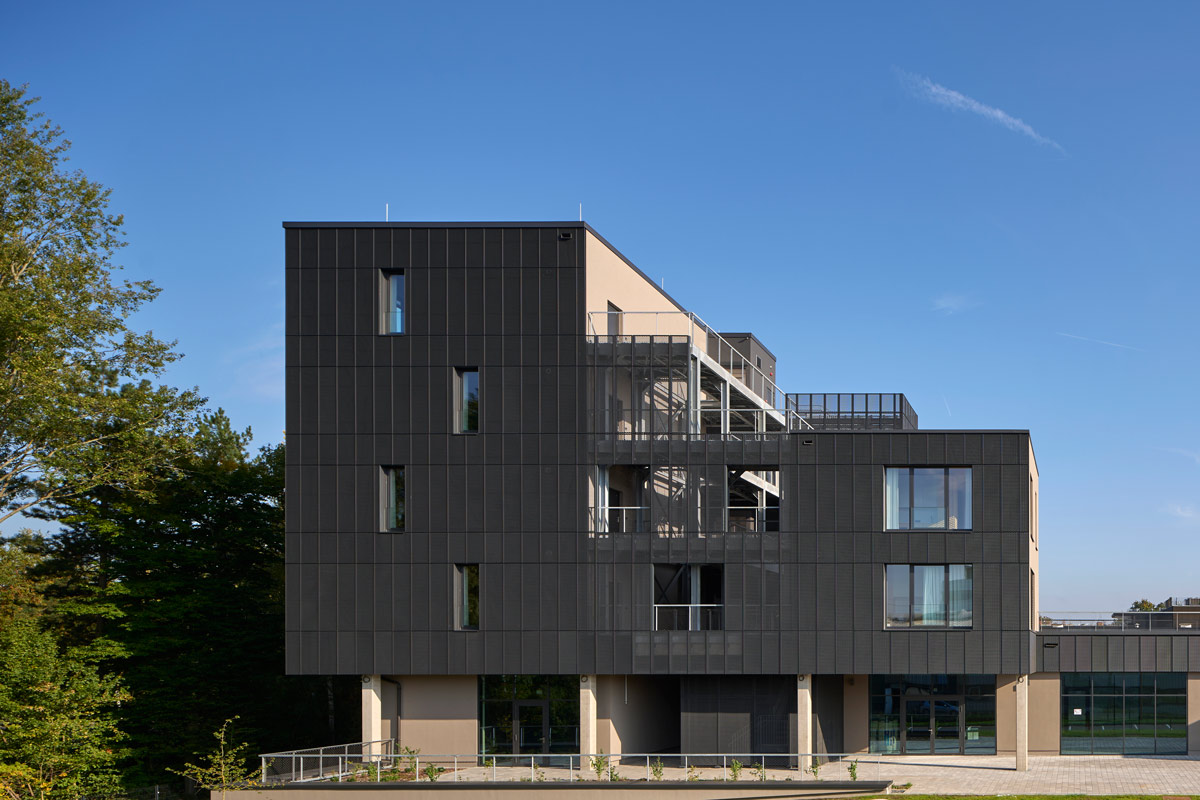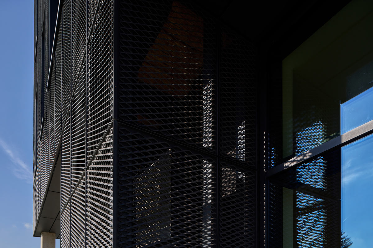 Les façades extérieures du volume principal sont constituées d’éléments métalliques déployés de teinte foncée faisant la liaison entre les fonctions logements et bureaux. Les façades intérieures présentent du crépi de teinte chaleureuse, renforçant le caractère convivial d’intérieur d’ilot.