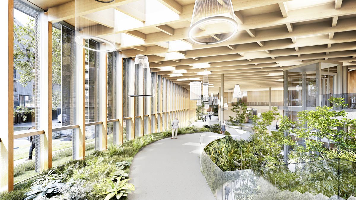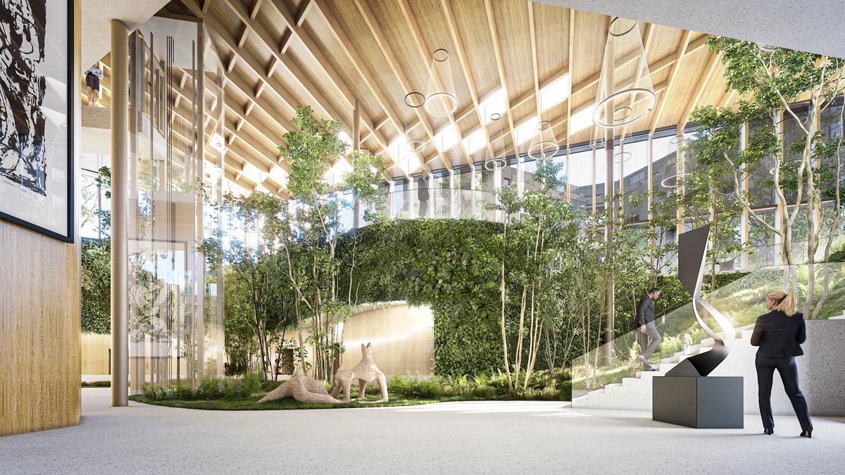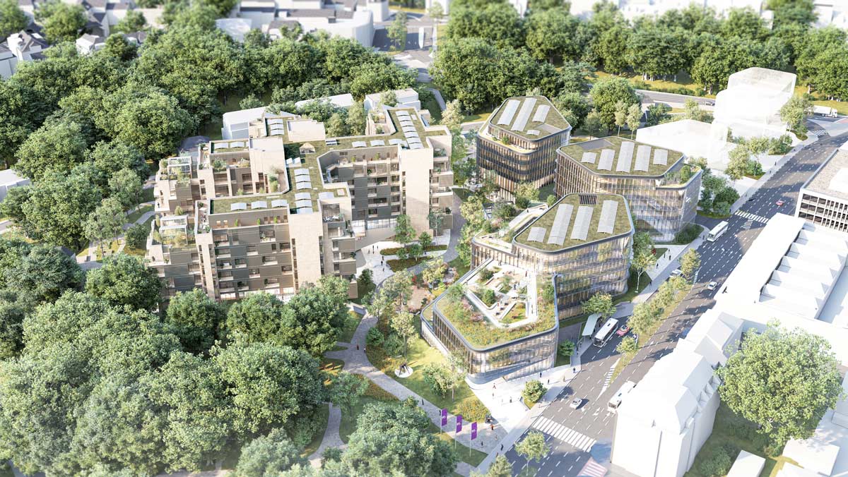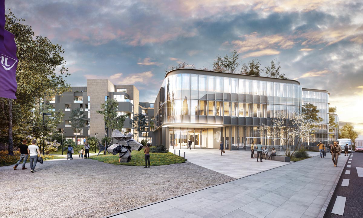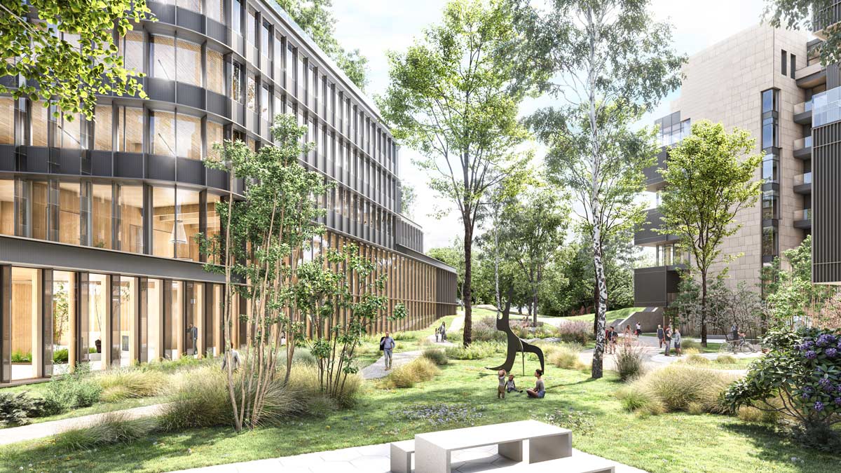 L’ensemble s’intègre dans un vaste paysage naturel reliant le parc Heintz à la vallée de la Pétrusse. La nature devient le fil conducteur du projet : elle structure les espaces, pénètre l’architecture et relie les différentes fonctions dans une continuité verdoyante. Cette conception biophilique favorise la reconnexion entre l’humain et son environnement, source de bien-être et de créativité.